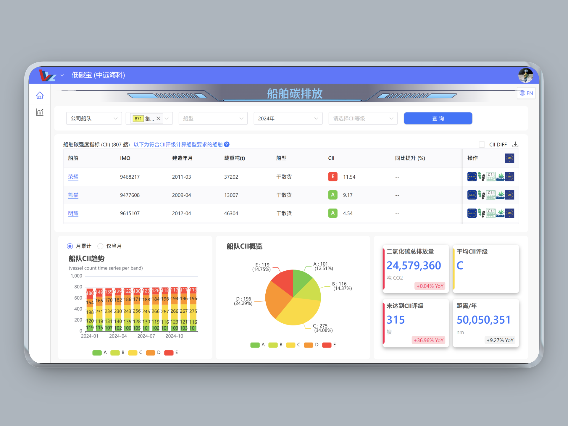 以 低碳宝为核心,构建覆盖全球 70 多万艘船舶的高精度能耗与碳排放模型,为企业提供从单船碳足迹监测到船队 CII 评级优化的一体化能力。