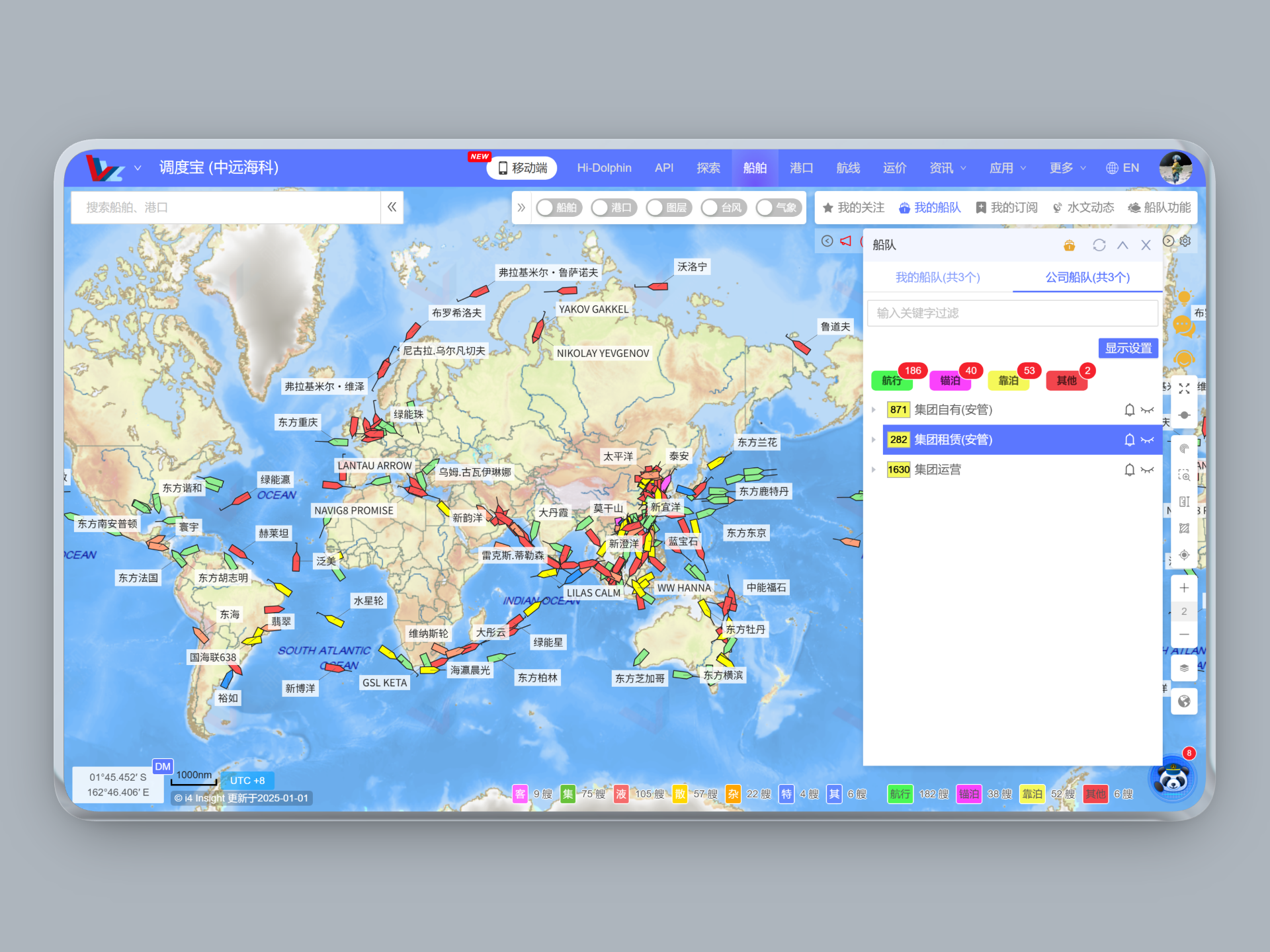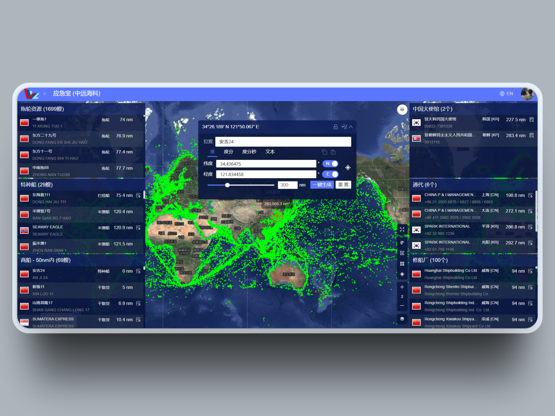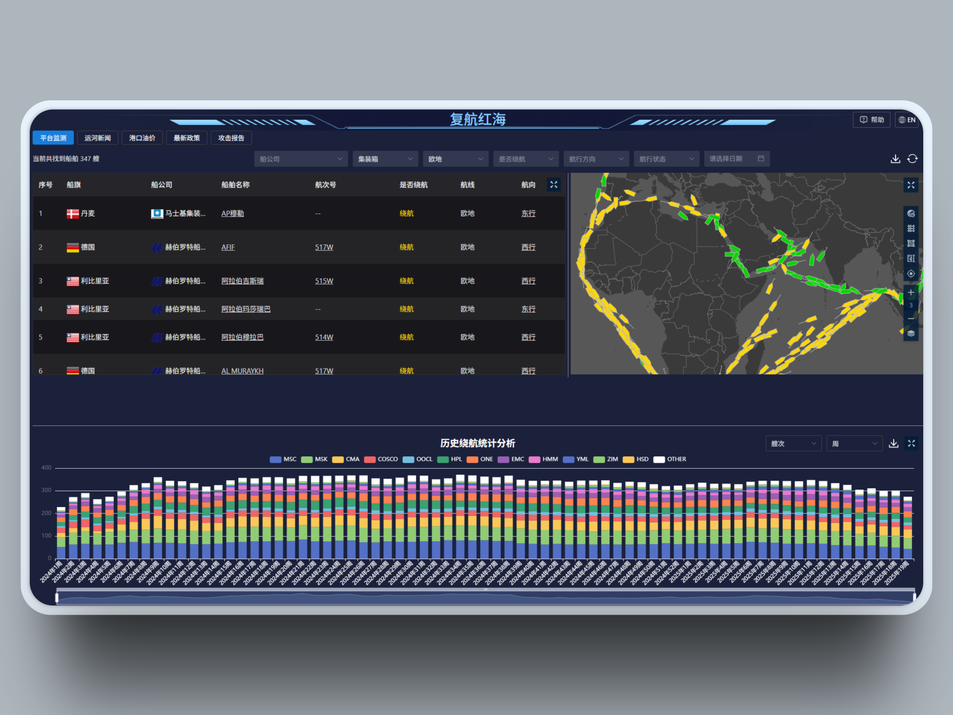 基于全球卫星、岸基和船基 AIS 数据以及气象、海况与港口信息,船视宝对船舶靠泊、装卸、加油、维修、等待、避台等 7 大类 22 类生命周期事件进行实时识别,并针对偏离航道、长时间锚泊、异常绕航等行为进行智能预警,为海务与安监团队提供全天候的船队安全态势视图。