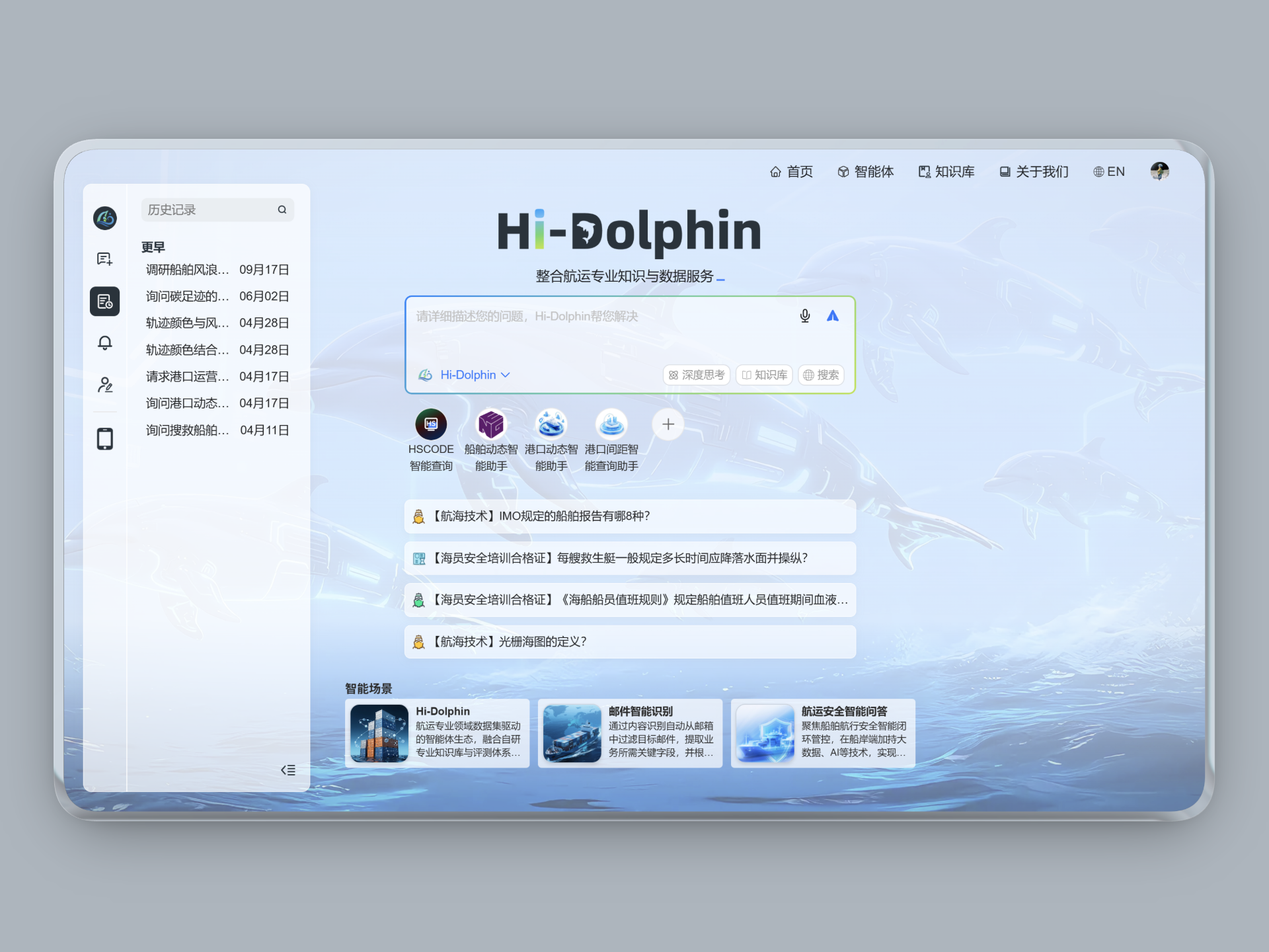 面向船舶运营、港口调度、货运贸易和金融风控等多类场景,依托 Hi-Dolphin 航运大模型,将行业合同、法规、案例与实时数据转化为可对话的知识与数据中枢。