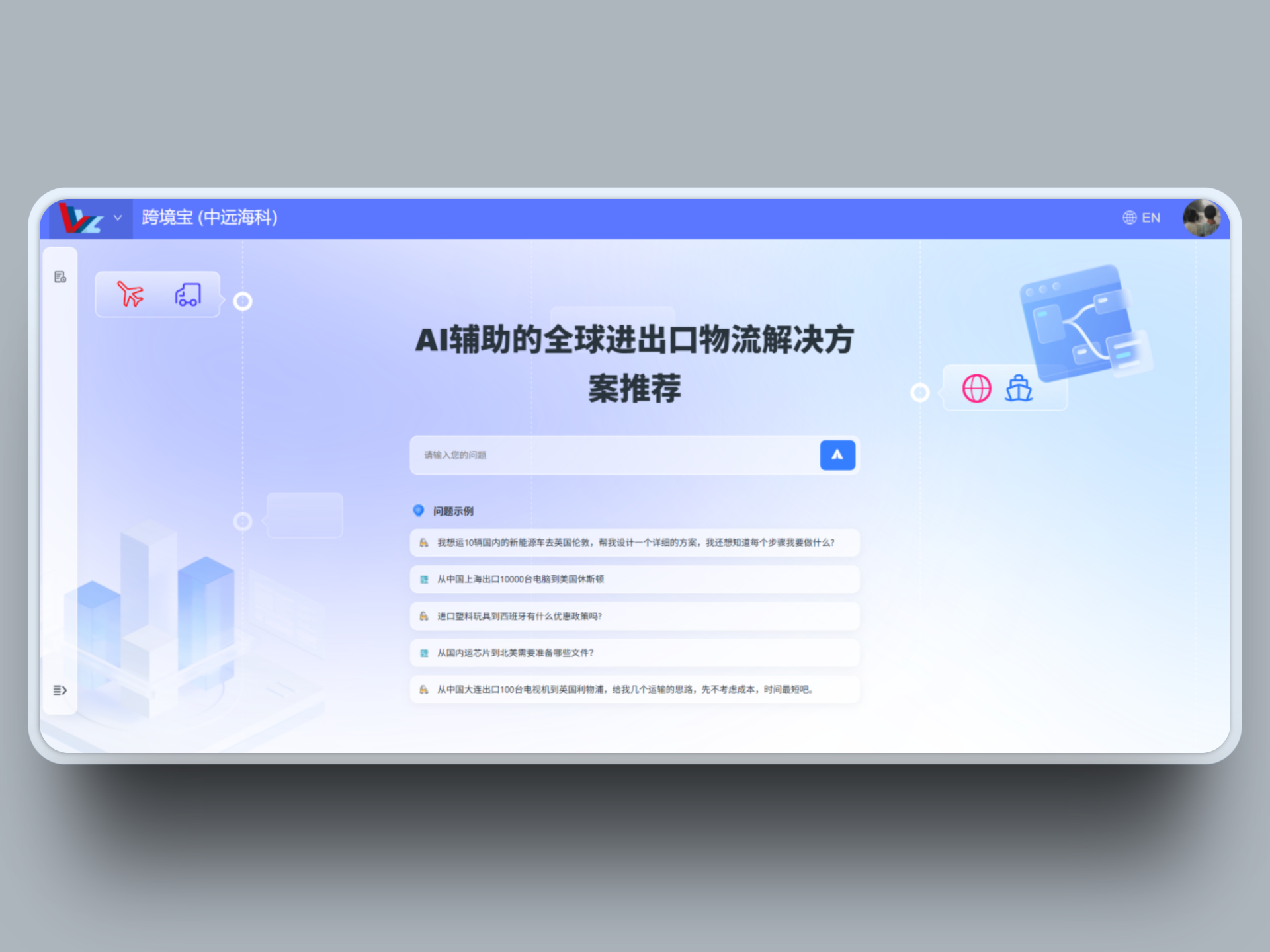 通过 100+ 航运智能体,为船公司、港口、货主及金融机构提供“所问即所得”的决策助手,一站式完成合规咨询、运营分析和报告生成,显著缩短从提出问题到拿到可用结论的时间。